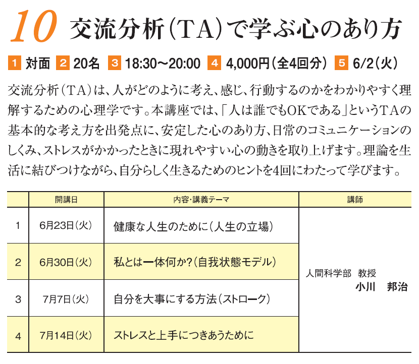 交流分析(TA)は、人がどのように考え、感じ、行動するのかをわかりやすく理解するための心理学です。本講座では、「人は誰でもOKである」というTAの基本的な考え方を出発点に、安定した心のあり方、日常のコミュニケーションのしくみ、ストレスがかかったときに現れやすい心の動きを取り上げます。理論を生活に結びつけながら、自分らしく生きるためのヒントを4回にわたって学びます。