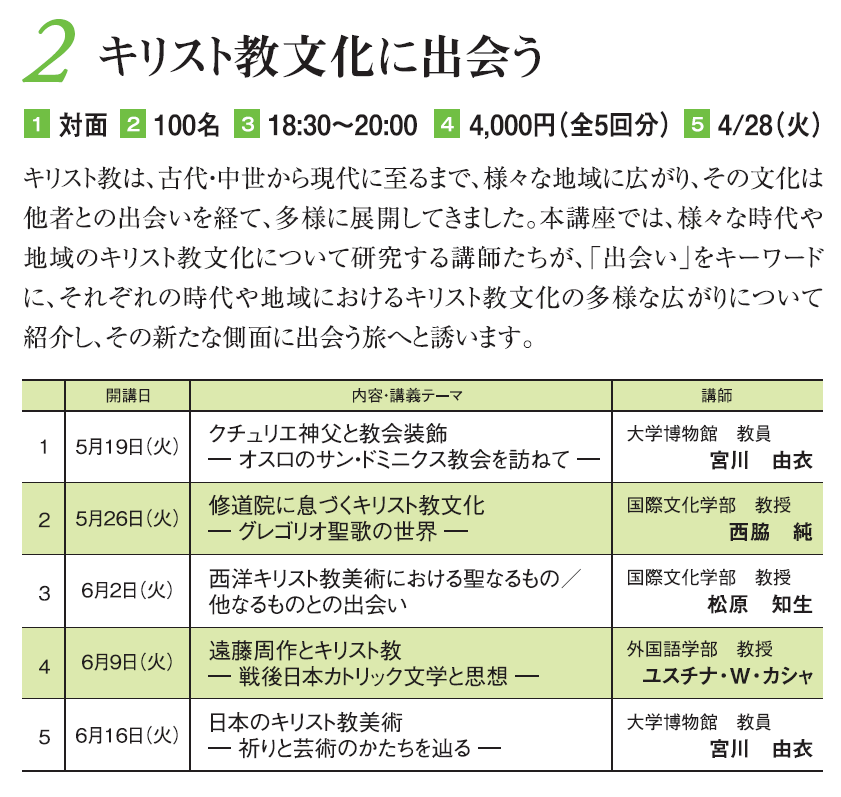 キリスト教は、古代・中世から現代に至るまで、様々な地域に広がり、その文化は他者との出会いを経て、多様に展開してきました。本講座では、様々な時代や地域のキリスト教文化について研究する講師たちが、「出会い」をキーワードに、それぞれの時代や地域におけるキリスト教文化の多様な広がりについて紹介し、その新たな側面に出会う旅へと誘います。