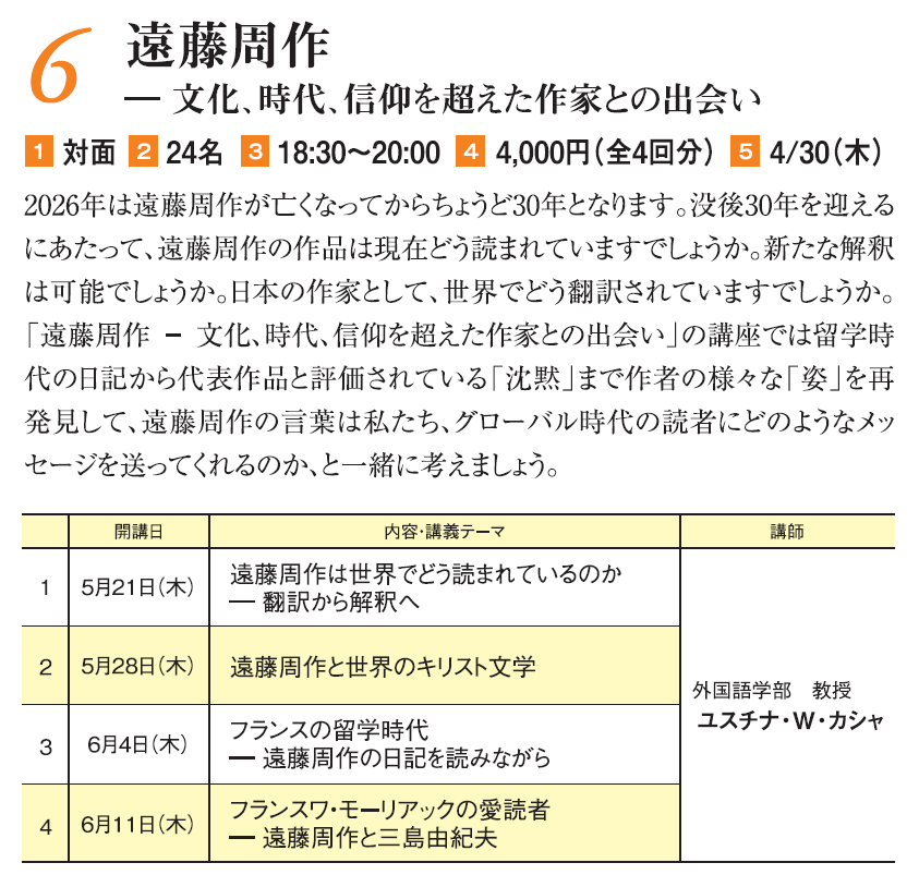 2026年は遠藤周作が亡くなってからちょうど30年となります。没後30年を迎えるにあたって、遠藤周作の作品は現在どう読まれていますでしょうか。新たな解釈は可能でしょうか。日本の作家として、世界でどう翻訳されていますでしょうか。「遠藤周作 ― 文化、時代、信仰を超えた作家との出会い」の講座では留学時代の日記から代表作品と評価されている「沈黙」まで作者の様々な「姿」を再発見して、遠藤周作の言葉は私たち、グローバル時代の読者にどのようなメッセージを送ってくれるのか、と一緒に考えましょう。