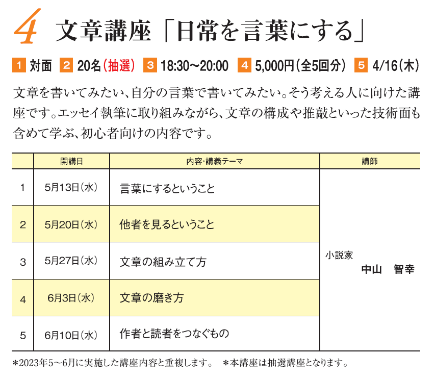 文章を書いてみたい、自分の言葉で書いてみたい。そう考える人に向けた講座です。エッセイ執筆に取り組みながら、文章の構成や推敲といった技術面も含めて学ぶ、初心者向けの内容です。