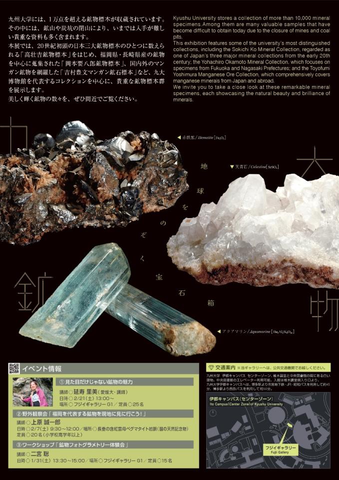 本展では、20世紀初頭の日本三大鉱物標本のひとつに数えられる「高壮吉鉱物標本」をはじめ、福岡県・長崎県産の鉱物を中心に蒐集された「岡本要八郎鉱物標本」、国内外のマンガン鉱物を網羅した「吉村豊文マンガン鉱石標本」など、九大博物館を代表するコレクションを中心に、貴重な鉱物標本群を展示します。美しく輝く鉱物の数々を、ぜひ間近でご覧ください。