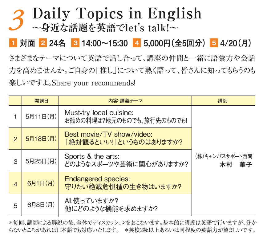 さまざまなテーマについて英語で話し合って、講座の仲間と一緒に語彙力や会話力を高めませんか。ご自身の「推し」について熱く語って、皆さんに知ってもらうのも楽しいですよ。Share your recommends!