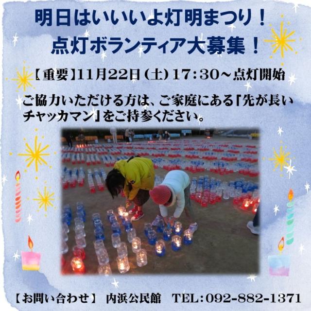 灯明まつり点火ボランティア大募集!! NEW 内浜公民館 2025年11月21日 5000個のキャンドルに火を灯し、幻想的な夜を一緒に作りませんか?今年も多くの方に愛される「人権のつどい&灯明まつり」が、いよいよ明日開催されます!キャンドルへの点火作業をスムーズに行うため、お持ちの方は先が長いチャッカマンをご持参いただけると大変助かります!もちろん会場でも準備していますのでご安心ください😊一人でも多くの方のご協力お待ちしています!