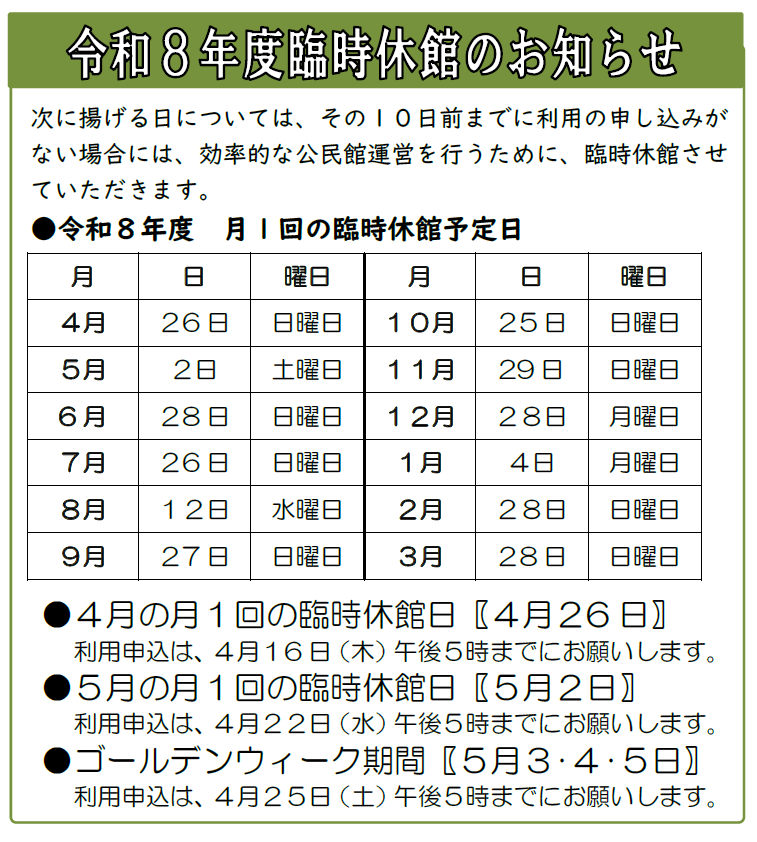 令和8年度 臨時休館のお知らせ🔔 | 内野公民館