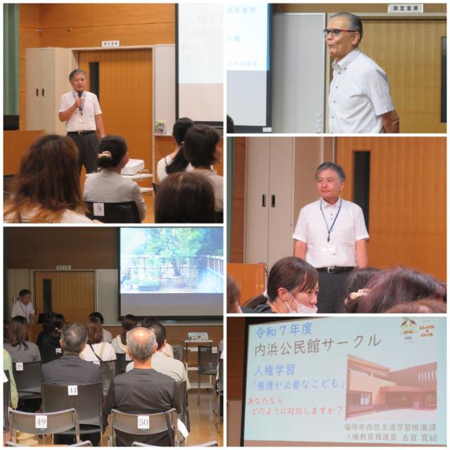 サークル人権学習第4回目を開催し、DVD「あなたのいる庭」を視聴しました。子どもの人権と社会的養護をテーマにした、心に響く作品でした。特に、施設で暮らす子どもたちや、施設を巣立った若者たち「ケアリーバー」が直面する偏見や困難について深く考えさせられました。彼らが持つ夢や不安、周りの大人や社会が果たすべき役割を改めて考えるきっかけとなりました。映像視聴後、人権教育推進員の古賀先生から、この問題に対する福岡市の具体的な取り組みを含めたお話がありました。社会的養護の環境として「地域密着型の小規模な施設」が良いという点です。「三つ子の魂百まで」この言葉を引用し、幼少期(特に3歳頃まで)に特定の大人の愛情のもとで安定した愛着関係を築くことが、子どもの将来の人格形成においていかに重要か強調されました。大規模施設よりも、家庭に近い環境である小規模グループケアや里親の方が、子ども一人ひとりにきめ細やかなケアを提供でき、それが子どもの健やかな成長に繋がります。その上で、先生は福岡市が里親の推進に力を入れており、実際に里親登録数が増加しているという明るい情報も紹介されました。いただいた感想に「福岡市に里親が多い事を初めて知りました。身近にもいるかも思うと、一気に現実みを帯びてきました。」「身近なところでそうしたご家族が孤立しないよう、温かく見守りたい」「里親家庭に対する無理解や偏見を持たないようにしたい」等とあり、地元福岡市の具体的な状況を知ることで、「社会的養護」という課題を「私たちの街の現実」として捉えることに繋がりました。