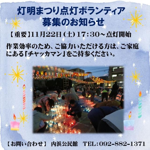 灯明まつり点灯ボランティア募集!! NEW 内浜公民館 2025年11月05日 「一緒に街を彩りませんか?灯明まつりの灯火にご協力をお願いいたします!」灯明の一つ一つに火を灯す作業は、地域の皆様と絆を深める大切な瞬間です。ぜひ、灯火にご協力をお願いいたします😊