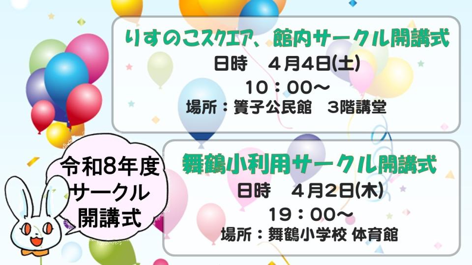 令和8年度サークル開講式 NEW 簀子公民館 2026年02月25日 令和8年度サークル開講式 りすのこスクエア・館内サークル開講式 日時 4月4日(土) 10:00~ 場所:簀子公民館 3階講堂 ---------------------------------------- 舞鶴小学校利用 サークル開講式 日時 4月2日(木)19:00~ 場所:舞鶴小学校 体育館