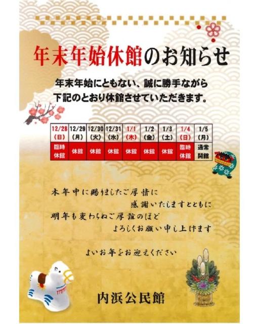 いつも内浜公民館をご利用いただきありがとうございます。早いもので、今年も残すところあとわずかとなりました。誠に勝手ながら、年末年始の期間、当館は休館させていただきます。休館中はお電話や窓口での受付も停止となりますので、ご注意ください。皆様にはご不便をおかけしますが、ご理解のほどよろしくお願いいたします。新年は1月5日から、また元気な皆様にお会いできるのを楽しみにしています🎍寒さが厳しくなってきましたが、どうか温かくして良いお年をお迎えください。