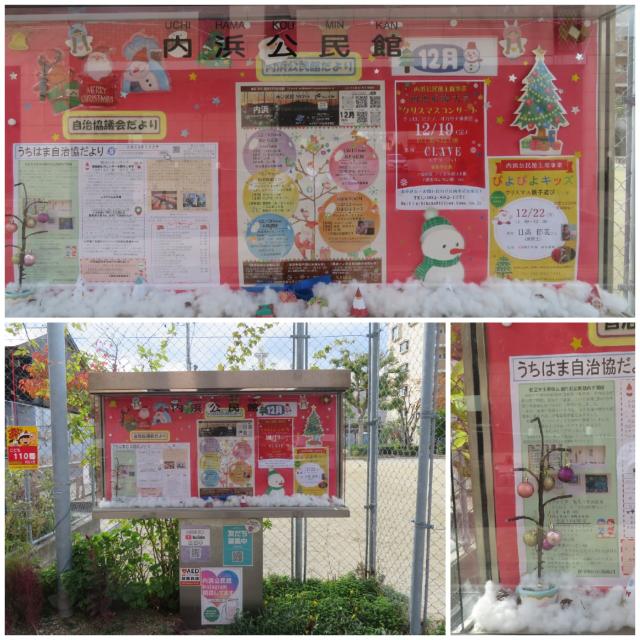 12月の掲示板 NEW 内浜公民館 2025年11月28日 公民館の掲示板も、クリスマス仕様になりました!夜になると小さなクリスマスツリーがキラキラと光ります。今年もあと1ヶ月。なんだかワクワクしますね✨お近くにお越しの際は、ぜひご覧になってくださいね😊