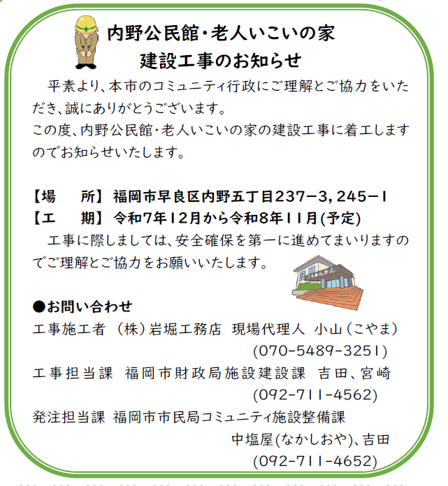 内野公民館・老人いこいの家建設工事のお知らせ🍀 | 内野公民館