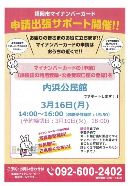 マイナンバーカード出張サポート NEW 内浜公民館 2026年03月06日 3月16日に内浜公民館で「マイナンバーカード出張サポート」が開催されます!マイナンバーカードをまだ作ってない方😊内浜公民館でサクッと申請しませんか?公民館に行くだけで申請ができるので、とてもスムーズですよ✨ポイントは【完全予約制】であること!3月10日までに予約を済ませておきましょう♪