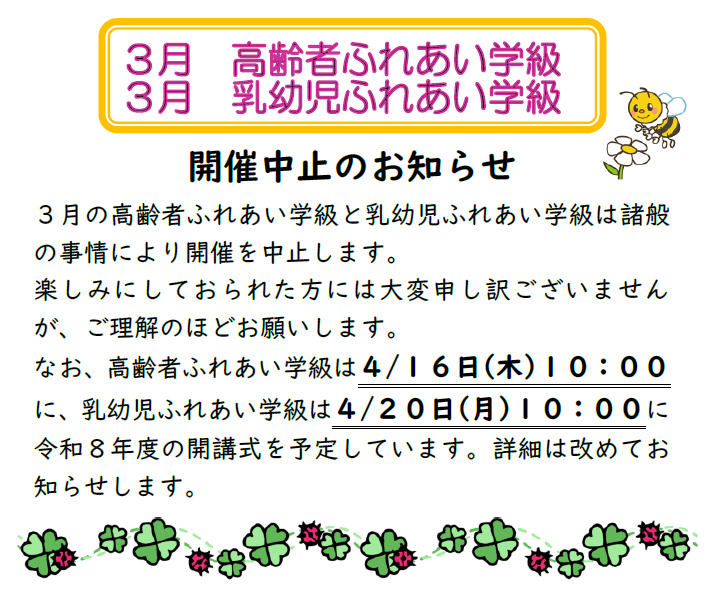 3月 高齢者ふれあい学級・乳幼児ふれあい学級のお知らせ🍀