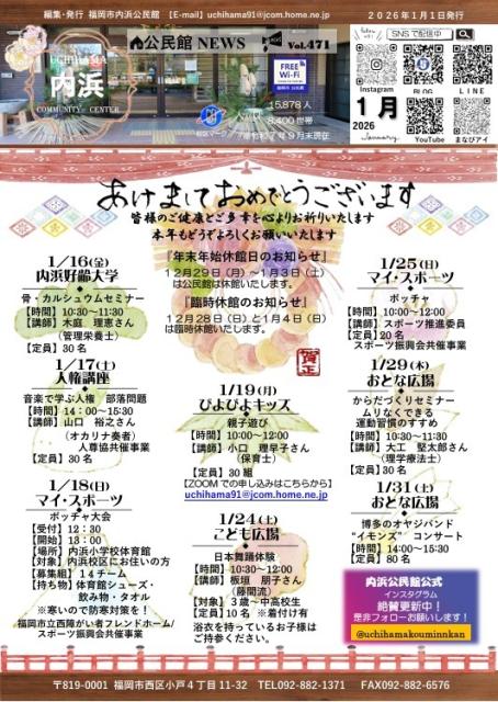 公民館ニュース1月号! NEW 内浜公民館 2026年01月01日 公民館ニュース新年号が完成しました🎍新しい講座案内など、今回もワクワクする情報をたっぷり詰め込んでます。順次地域の皆さまのお手元にも届く予定です。各講座、定員になり次第締め切りとなりますので、気になるものはぜひお早めにお申し込みくださいね😊