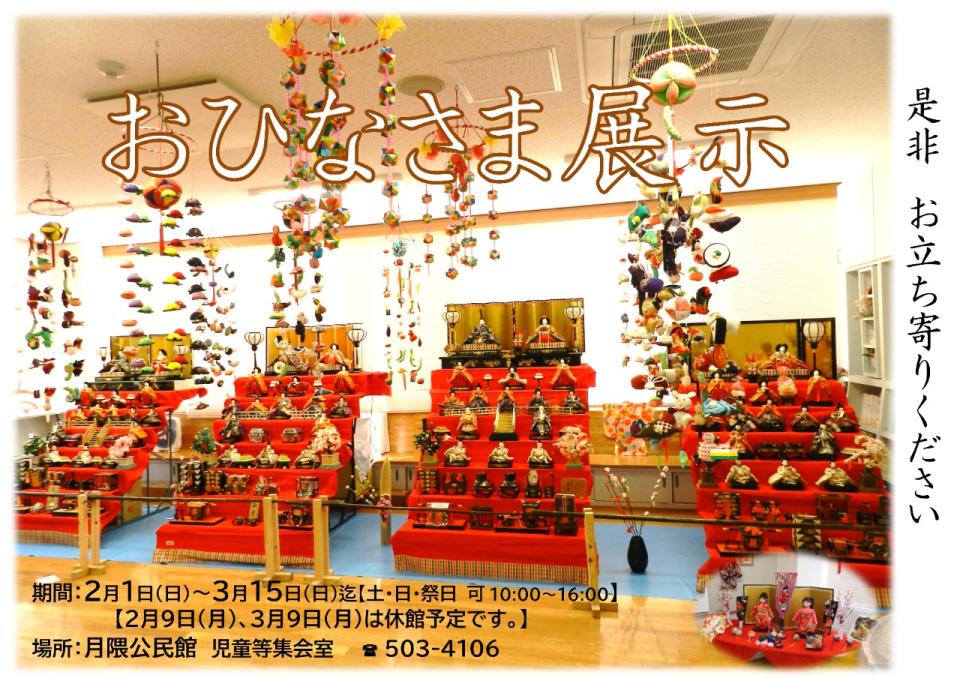 おひなさま&さげもんを展示しています♪ NEW 月隈公民館 2026年01月27日 期 間:2月1日(日)~3月15日(日) 【土・日・祭日可】10時~16時まで ※2/9(月)、3/9(月)は、休館予定です。 場 所:月隈公民館・児童等集会室 ★どなたでも見学できます! 是非お立ち寄りください♪